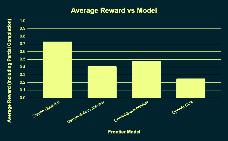 We evaluated PA Bench on major frontier computer use models, including Claude Opus 4.6, Gemini 3 Pro, Gemini 3 Flash, and OpenAI Computer Use. We selected these four models because they natively support computer-use actions, whereas other frontier models such as GPT-5.2 currently do not. All agents used a shared canonical action space, with screen resolution set to the provider recommended configuration for each model. We additionally exposed a standardized tab-switching action to support cross application workflows. We capped each episode at 75 steps.