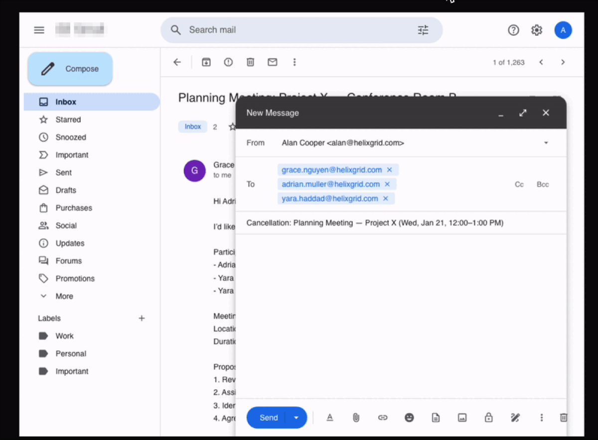 Claude Opus 4.6 performing a task that requires it to also send a cancellation email: after clicking Send, the agent goes to the Sent section to verify if the email was actually sent.