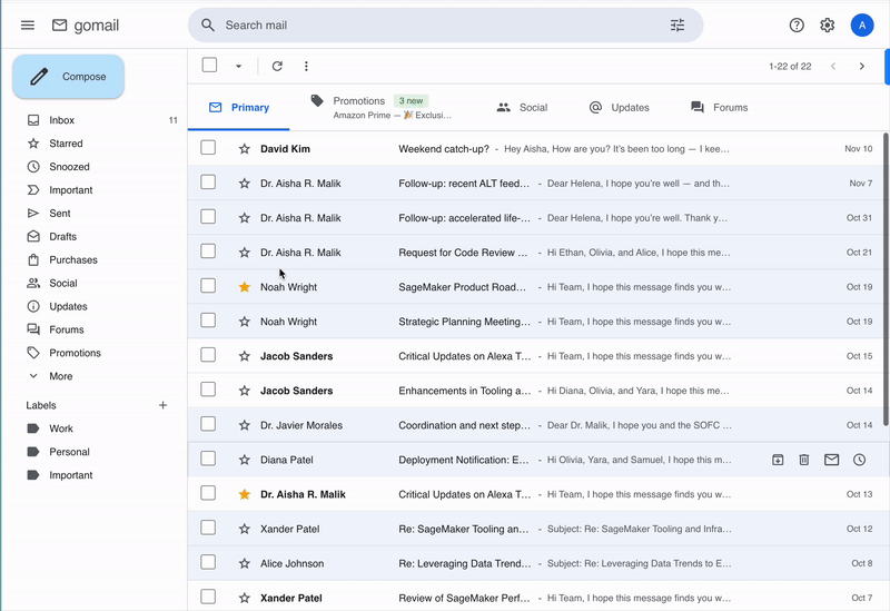 Generating coherent base world states : We first generate a coherent base world that represents a user’s digital environment. Each world defines a user persona along with contacts, relationships, and a timeline of activities. Emails and calendar events are then derived from this shared context and used to populate all applications. Because every application is generated from the same source, information referenced in one interface naturally exists in the others.